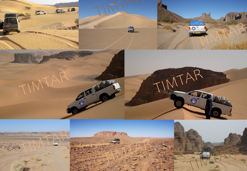 vous voyagez à bord des véhicules tout-terrain 4x4 de Timtar, chacun ayant un chauffeur expérimenté de l’agence et tous dirigés par un chauffeur-guide de Timtar qui est le chef d’expédition. Vous découvrez avec eux, à choix : les régions du Tassili N’Ajjer Ouest, de la Tadrart, du massif volcanique de l’Ahaggar, de la Tefedest.